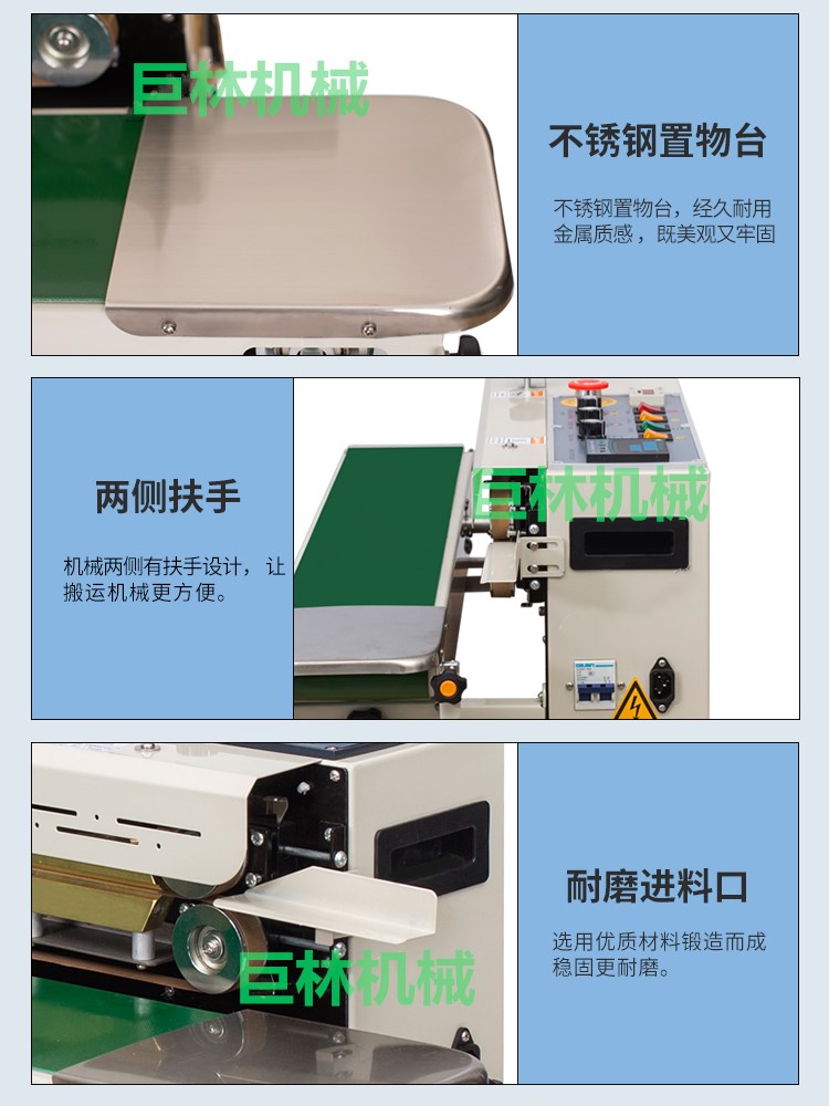 該機具有連續(xù)輸送、封口、油墨印制標簽(出廠日期、生產(chǎn)批號等)一次完成之功效,可封合印制任何一種可熱性的薄膜。